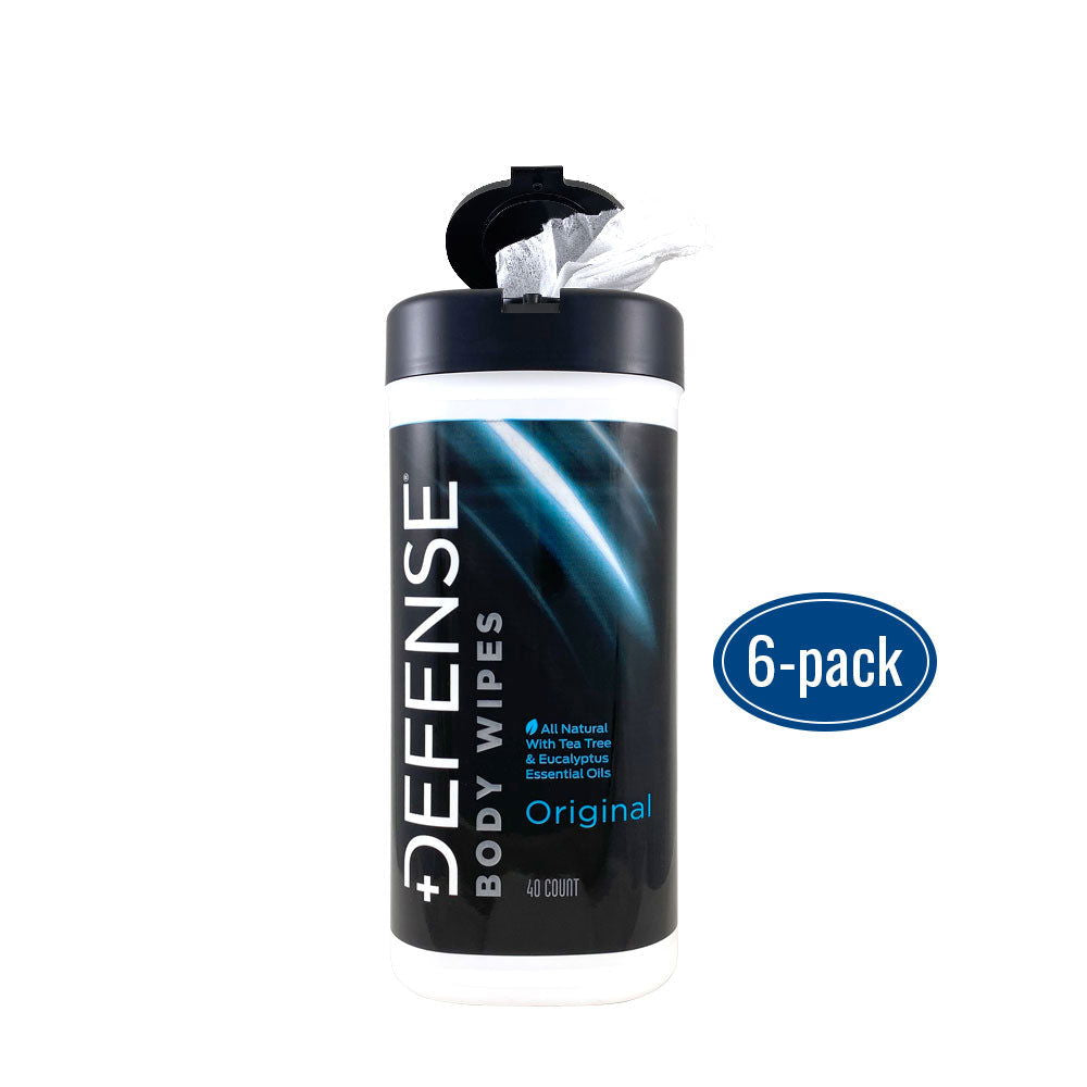 Defense original body wipes contain the same 100% natural essential oils as our bar soaps and shower gels. Our body wipes are not intended to replace showering but to cleanse the skin when you are unable to take a shower within four hours of training or competing. This four hour period is the critical window for contagions to develop. They are designed to be portable for easy use and our thick cloth is durable enough for heavy use. Our wipes fit perfectly in the side pouch of any gear pack or can be easily thrown into a duffel bag without leaking. The natural tea tree and eucalyptus oil that we use in our body wipes provide a spectrum of antimicrobial benefits and promote healthy skin. Our wipes never contain any parabens, sulfates, SLS, triclosan, or fragrances. This product is made in the USA.
